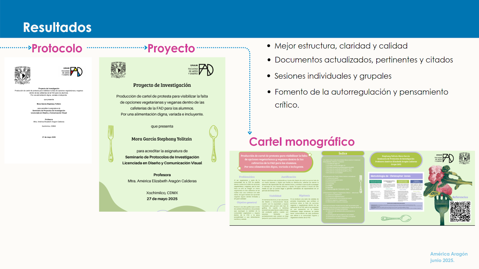 Durante el quinto semestre, a partir de esta recopilación de citas y referencias, las y los estudiantes tienen que entregar un protocolo de investigación completo. Ya para el sexto semestre, redactan el primer capítulo de su proyecto, junto con el diseño de un cartel monográfico que destaca los puntos más relevantes de su investigación. (Figura 2)